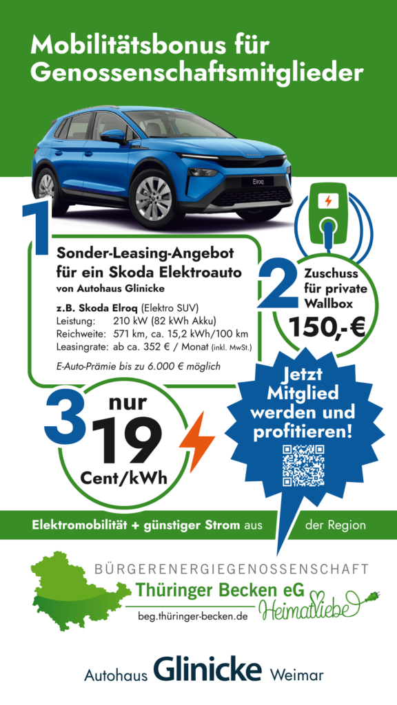 In Kooperation mit dem Autohaus Glinicke Weimar startet die Bürgerenergiegenossenschaft Thüringer Becken (BEG) ein Sonderleasing für ausgewählte E-Auto Modelle und zahlt ihren Mitgliedern einen Zuschuss für die Lademöglichkeit zuhause (Wallbox). In Kombination mit dem Mitgliedertarif für Strom bietet die BEG somit eine attraktive Lösung, um unabhängig von den Preisen für Diesel und Benzin zu werden.